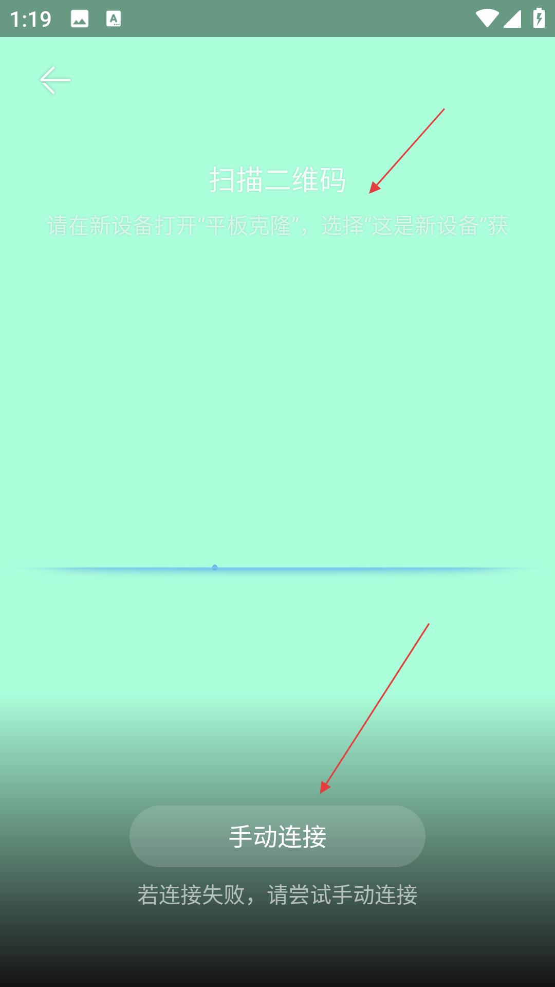 3、掃描二維碼界面,用戶可在新設備打開平板克隆并選擇這是新設備,然后掃描二維碼進行連接,若連接失敗可嘗試手動連接。
