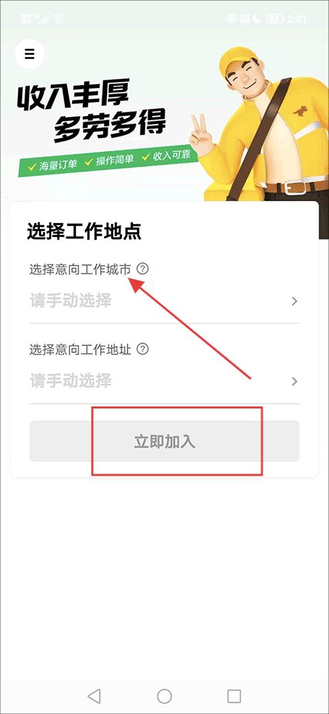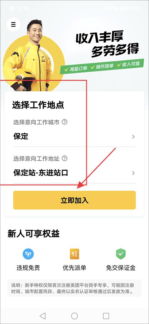 2、選好保定城市及地址后,點擊立即加入,提交工作地點信息,結合新人權益,推進配送員注冊進程。