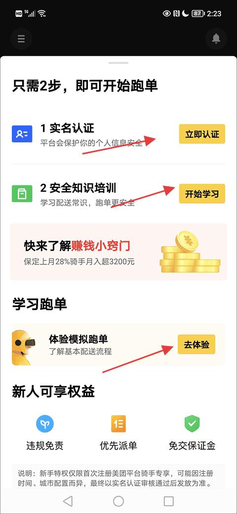 3、注冊后續頁,顯示跑單需實名認證、安全培訓兩步,點擊立即認證,開始學習完成流程,還有模擬跑單體驗,幫新人熟悉配送,開啟接單。