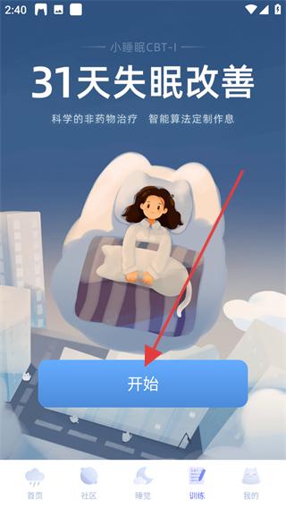 1、進入睡眠改善類軟件訓練頁面,可看到31天失眠改善的科學非藥物治療項目,點擊開始進入失眠評估頁面。