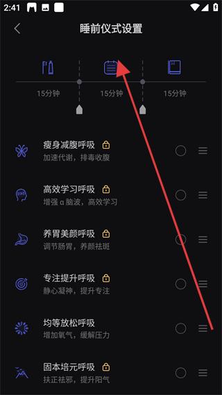 4、在睡前儀式設置頁面可選擇不同時長的儀式階段,還有瘦身減腹呼吸、高效學習呼吸等呼吸訓練,設置適合自己的睡前儀式,幫助改善睡眠。