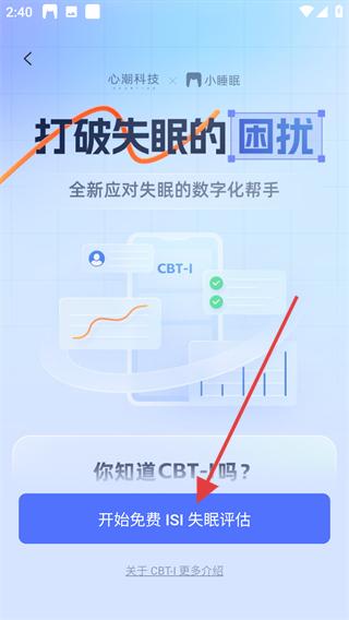 2、在失眠評估頁面點擊開始免費ISI失眠評估,可進行專業的失眠狀況評估,了解自身睡眠問題。
