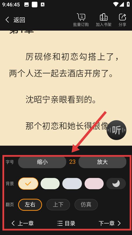 3、進入小說閱讀界面底部彈出設置欄,可調節字號大小切換背景顏色,選擇左右、上下或仿真翻頁模式,還配備聽書功能。