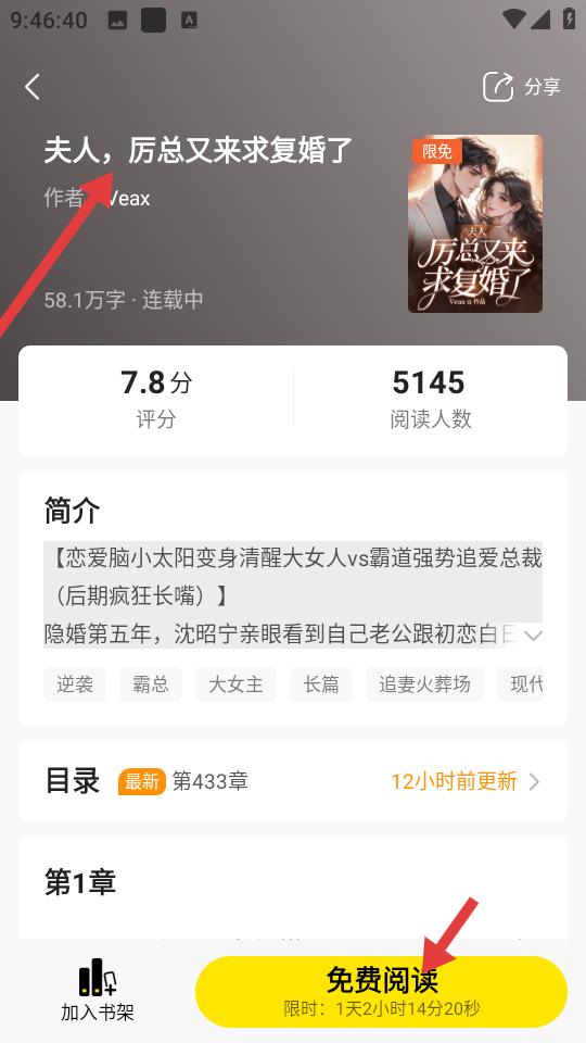 2、進入小說的詳情頁頂部展示書名與作者,標注字數和連載狀態,簡介透露戀愛腦變清醒大女主的劇情,免費閱讀按鈕限時可用點擊閱讀。
