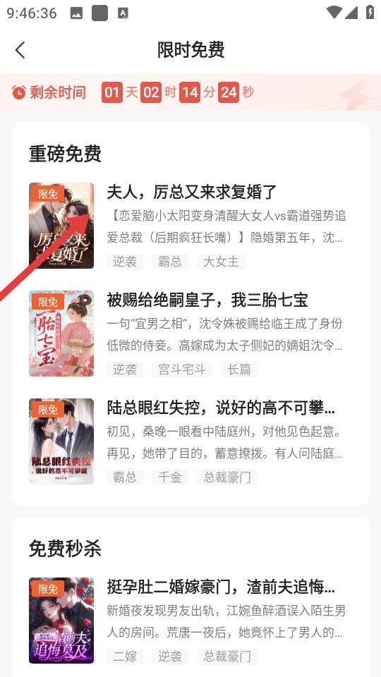 1、限時免費界面頂部顯示剩余時間倒計時,下方羅列多部限免小說,分重磅免費與免費秒殺板塊,每本標注題材標簽。
