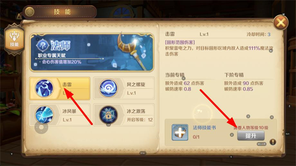 1、在技能界面提升法師的擊雷等技能,消耗法師技能書提升技能等級,增強技能的傷害和效果,提升戰斗能力。