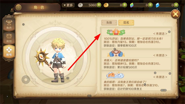 4、查看花名等稱號,不同稱號有不同的屬性加成和獲取途徑,獲取稱號提升角色的屬性,增強角色實力。