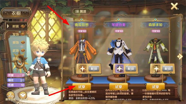 2、在衣櫥可試穿南瓜狂想等時裝,不同時裝有不同屬性加成,試穿時裝提升角色的可愛、鎮壓等屬性,豐富角色外觀。