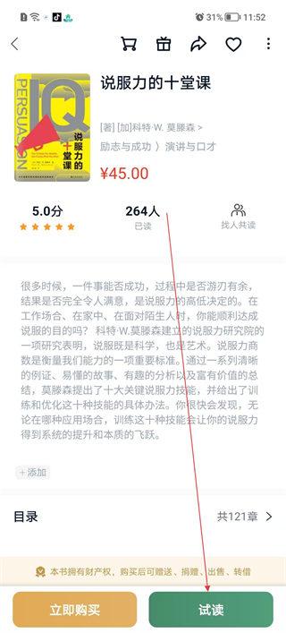 4、在書籍詳情頁查看書籍的評分、已讀人數及目錄信息,點擊試讀按鈕,體驗該書的部分內容。