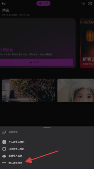1、下載安裝潑辣app打開軟件,進入潑辣簡潔且富有設計感的主界面,你會看到各類修圖功能入口,點擊右上角選項,選擇輸入濾鏡簡碼,準備導入獨特濾鏡配方。