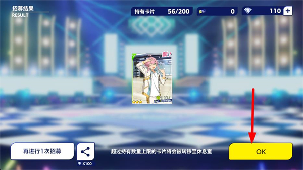 3、招募后會獲得偶像卡片,點擊OK確認招募結果,超過持有數量上限的卡片會被轉移至休息室。