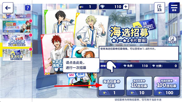 2、可參與海選招募,使用海選招募券進行招募,有機會獲得1到4星的卡片,擴充偶像卡片陣容。