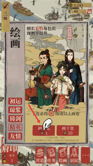 2、進入繪畫界面,可選擇畫一張,消耗資源進行繪畫,有機會獲得擅長農牧等的角色,助力城市發展。