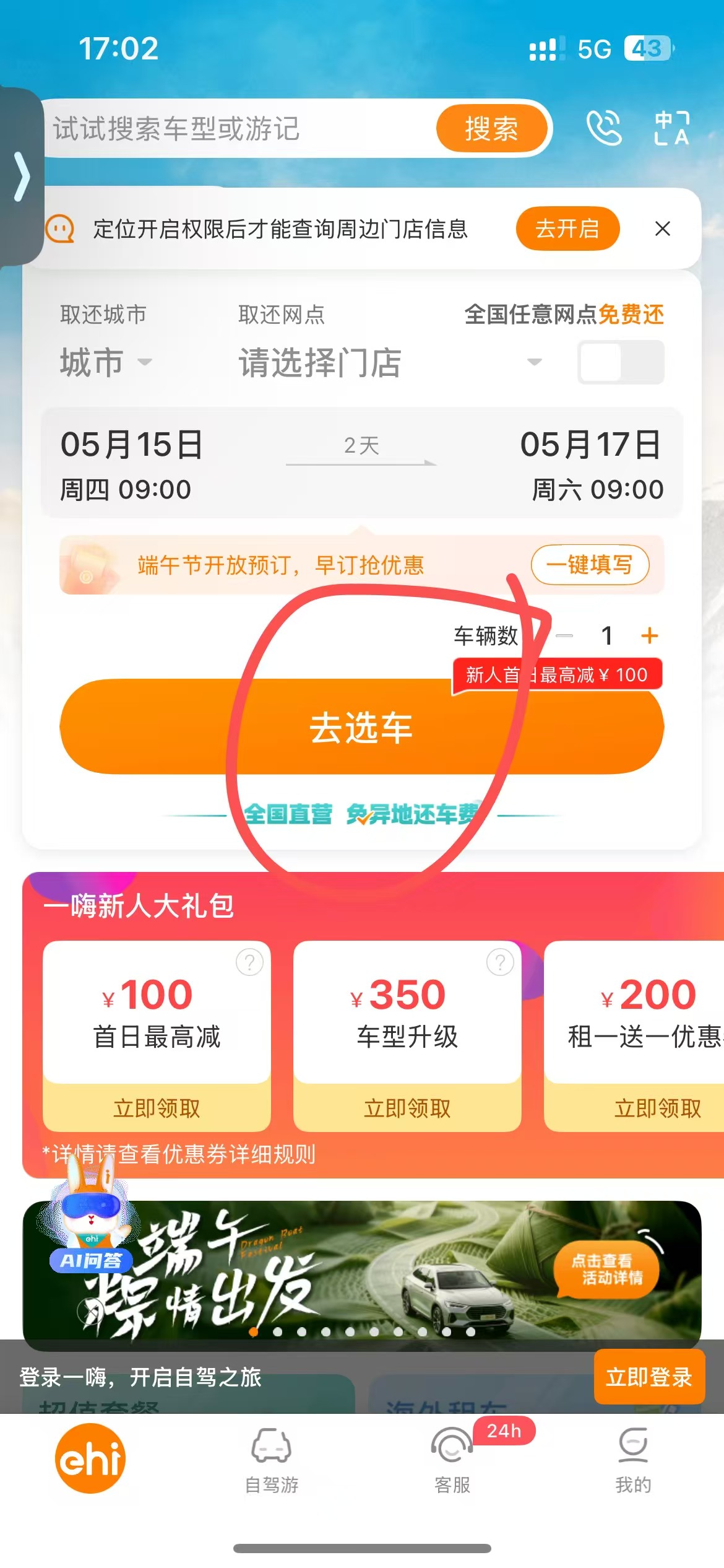 3、來到主頁面,視線來到圖中圓圈位置,點擊去選車,即可進入選車界面,但是要注意有沒有登錄哦。