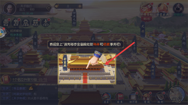 1、需前往金鑾殿處理科舉和稅賦事務,點擊金鑾殿進入,開展朝政處理,掌控國家事務。