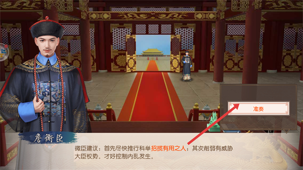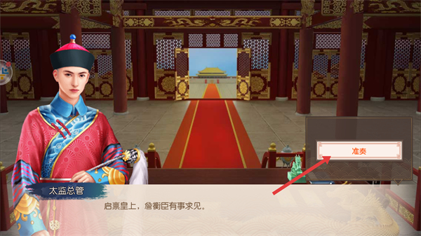 2、在金鑾殿內,太監總管會稟報事務,點擊準奏按鈕,處理宮中事宜,推進劇情和政務進程。