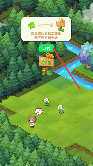 1、森靈值達到指定數量即可開啟新土地,點擊開發按鈕,就能解鎖新的游戲區域,繼續探索森靈合成的樂趣。