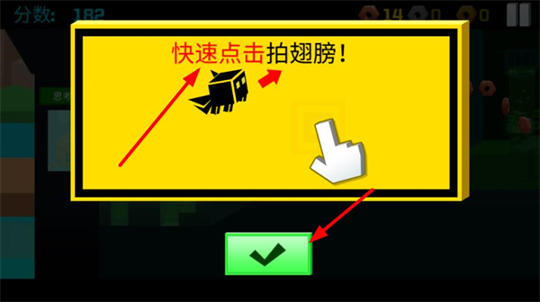 1、看到快速點擊拍翅膀的提示,按指引快速點擊對應區域讓萌寵拍翅膀,完成后點擊綠色對勾,推進流程同時積累分數。
