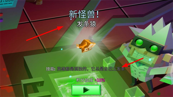4、解鎖新怪獸發條猿,了解其技能是自己上發條,同時獲得積分加成,點擊按鈕繼續游戲,借助新怪獸提升冒險收益。