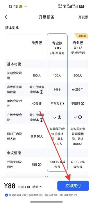 3、在升級服務頁面點擊版本對比,查看免費版、專業版、商業版在發起會議規模、單場會議時長等方面的區別,選擇適合的版本。