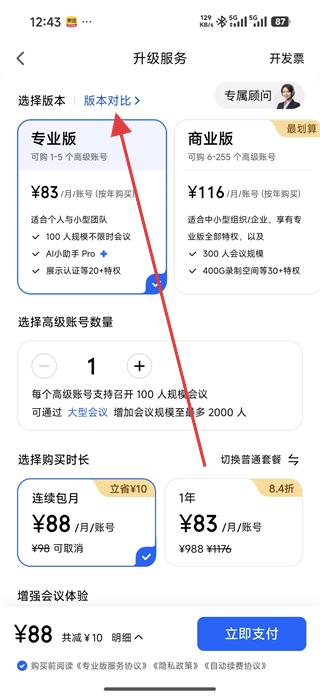 4、選擇專業版設置高級賬號數量和購買時長,點擊立即支付,完成專業版服務購買,享受不限時會議、小助手Pro等高級權益。