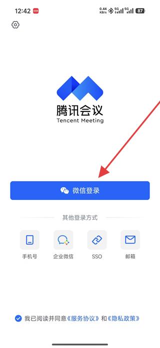1、進入騰訊會議APP登錄頁面,選擇微信登錄,勾選同意服務協議和隱私政策,完成登錄,獲取會議功能使用權限。