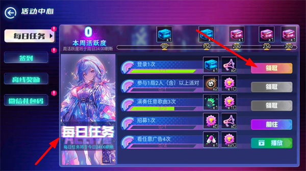 3、完成每日任務可領取獎勵,參與派對、演奏歌曲等任務,提升活躍度獲取寶箱、道具等。