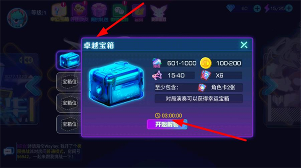 4、可開啟卓越寶箱,獲得金幣、角色卡等獎勵,通過對局演奏獲取幸運寶箱,開啟積累資源。