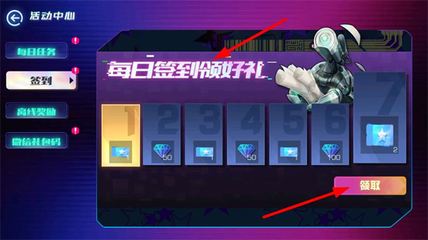 2、在活動界面可每日簽到領取好禮,通過簽到積累鉆石、道具等獎勵,助力游戲進程。