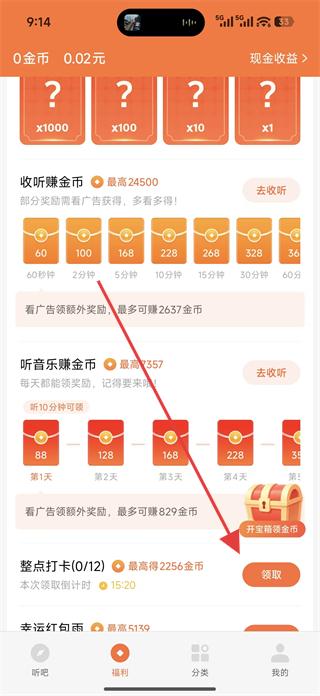 2、在福利頁面瀏覽收聽賺金幣、聽音樂賺金幣等多種賺金幣方式,點擊整點打卡的領取按鈕,獲取金幣獎勵。