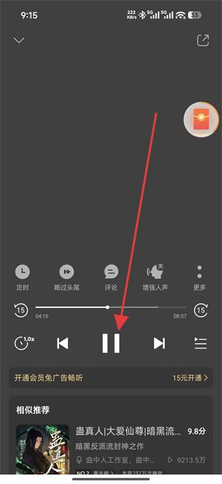 3、選擇感興趣的音頻作品,進入播放頁面,點擊播放按鈕,開始收聽音頻內容,還可進行定時。