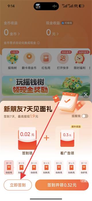 1、進入軟件福利頁面,看到新朋友7天見面禮的簽到提示,點擊立即簽到,領取簽到獎勵。