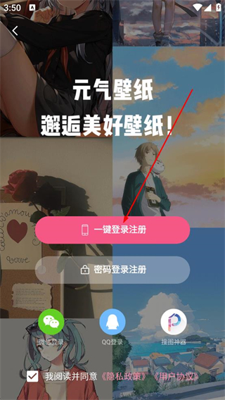 1、打開元氣壁紙軟件,登錄頁面選擇一鍵注冊或者登錄,登錄后可解鎖更多的功能。