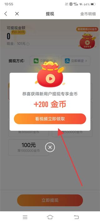 2、進入提現頁面領取新用戶提現專享金幣,點擊看視頻立即領取,獲取額外金幣獎勵,提升提現金額的積累速度。