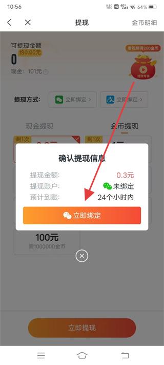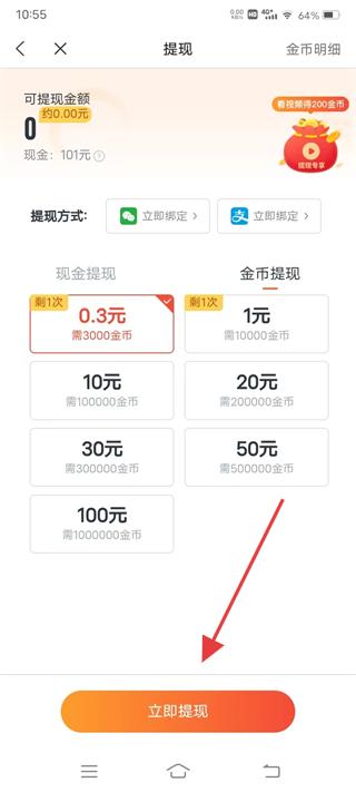 3、在提現頁面查看現金提現與金幣提現的額度要求,如0.3元需3000金幣等,選擇合適的提現金額,點擊立即提現,進入提現流程。