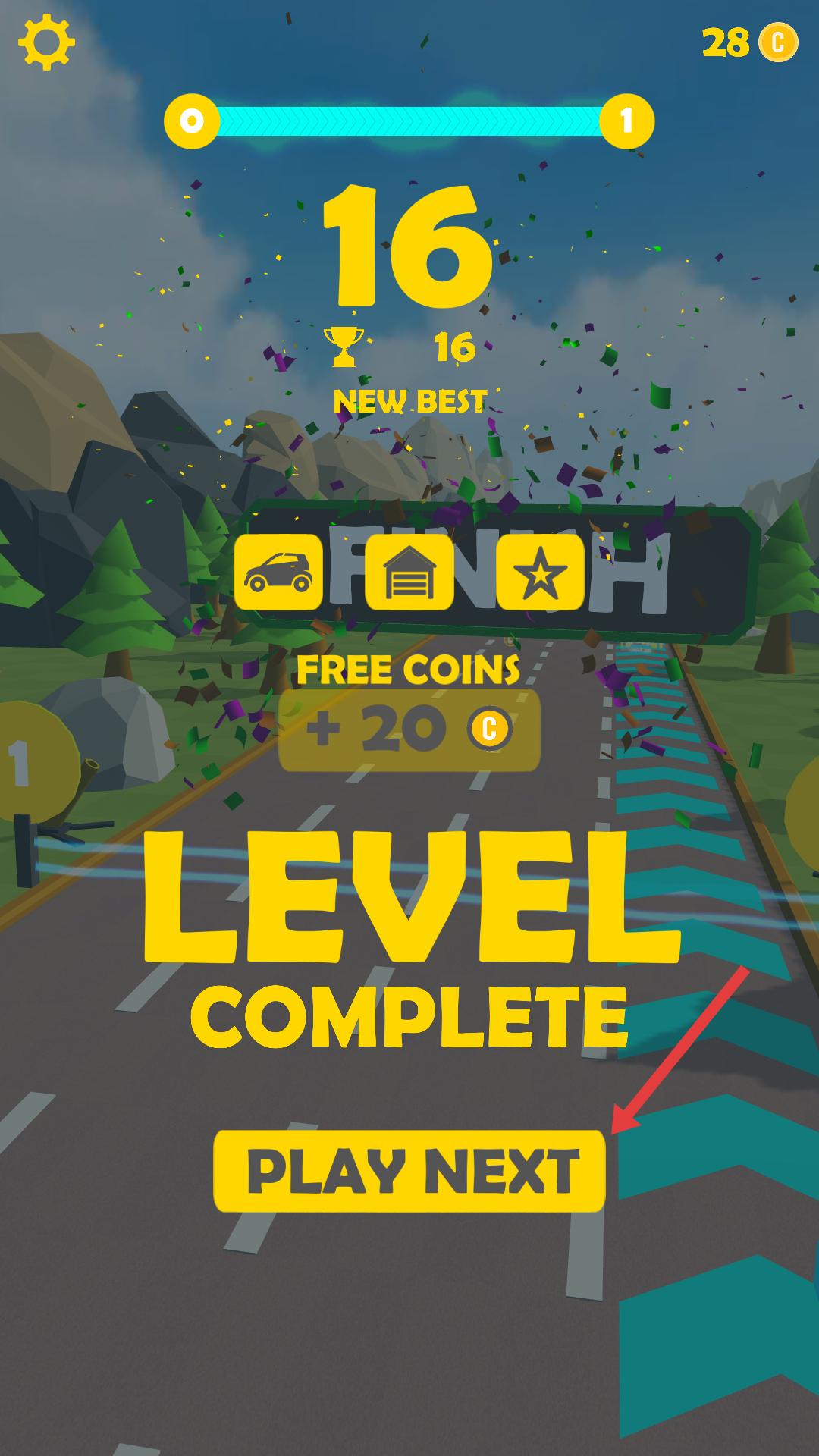 3、成功到達終點后,會顯示LEVEL COMPLETE,還能獲得20個免費金幣,此時點擊PLAY NEXT,即可進入下一個關卡繼續挑戰。
