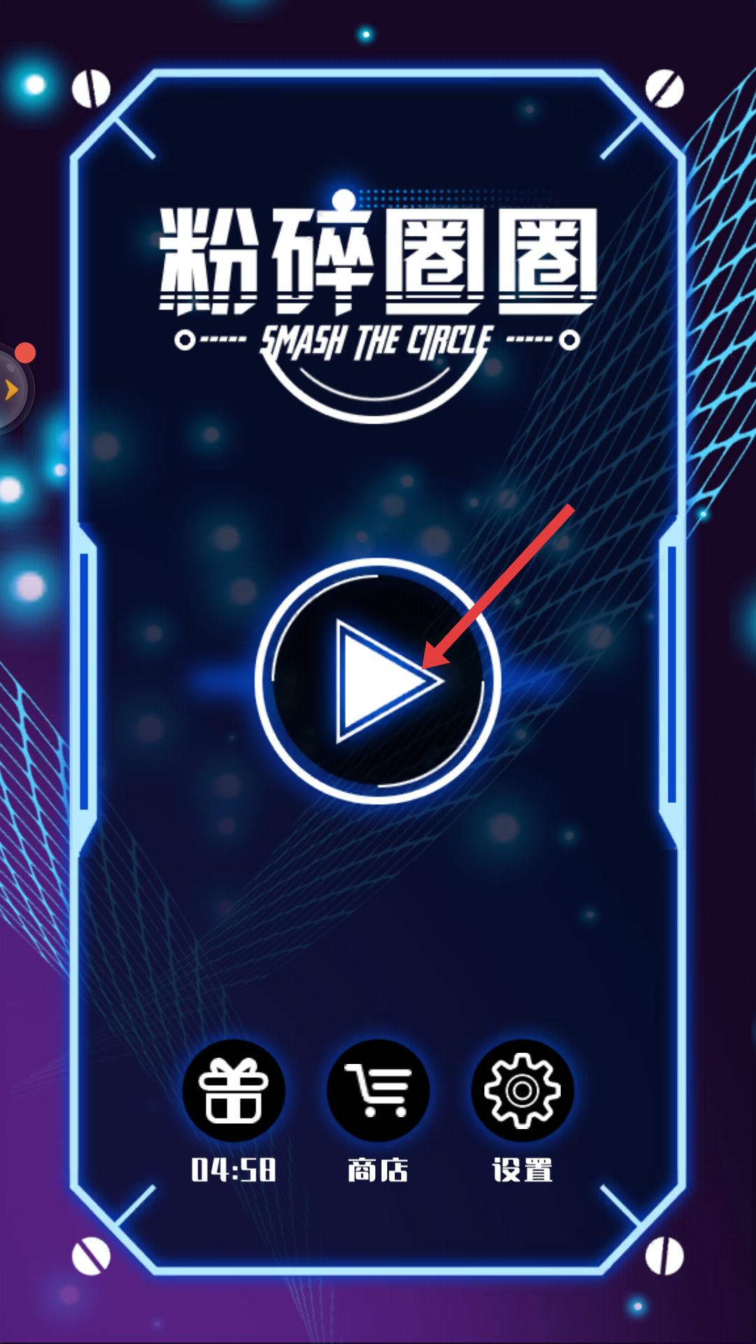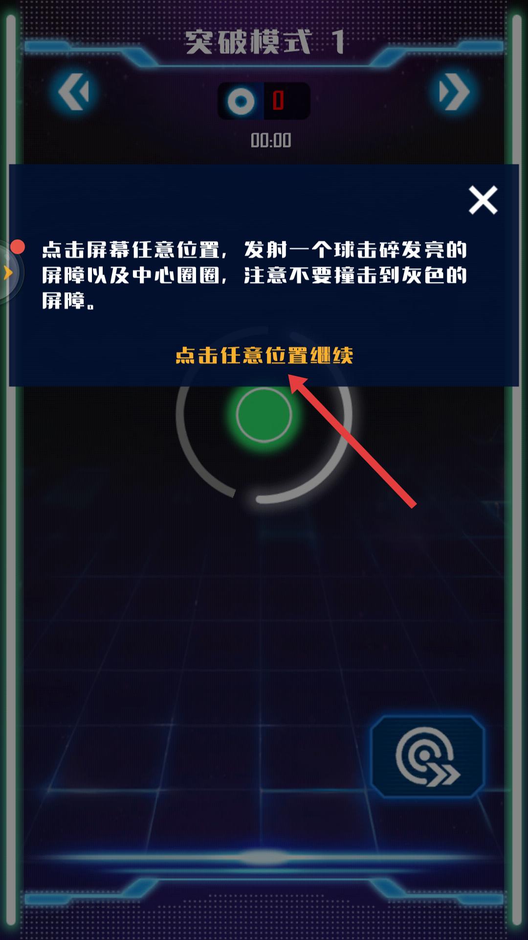 4、突破模式第1關界面,提示點擊屏幕任意位置發射球,擊碎發亮屏障和中心圈圈,避開灰色屏障,點擊任意位置,開始游戲。