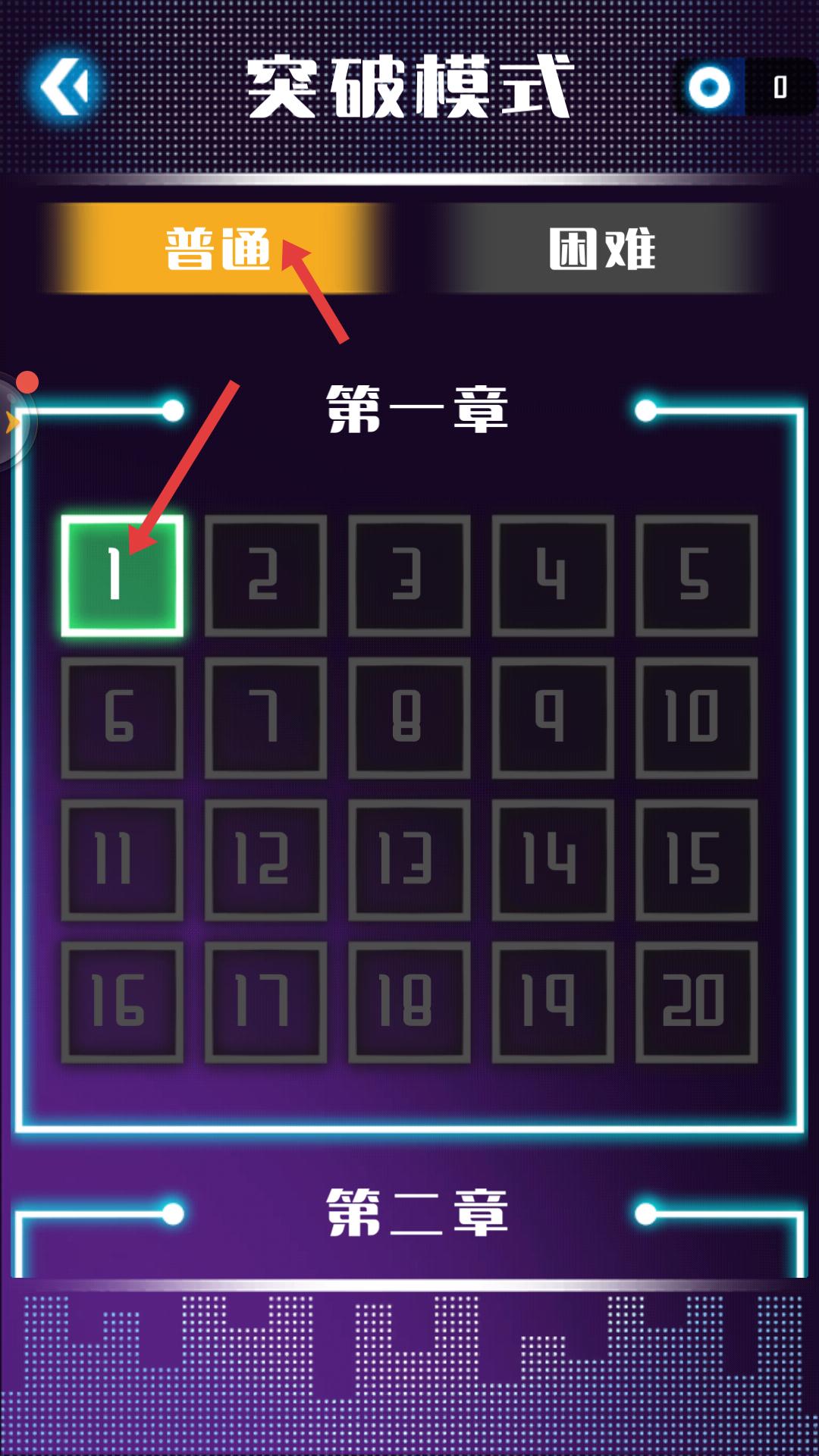 3、突破模式關卡選擇界面,有普通和困難難度,選擇普通難度,點擊第一章的第1關,進入突破模式第1關游戲界面。