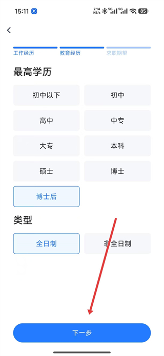 4、在教育經歷頁面選擇最高學歷,如博士后,再選擇學歷類型,如全日制后點擊下一步,完善教育背景信息,完成在線簡歷的創建。