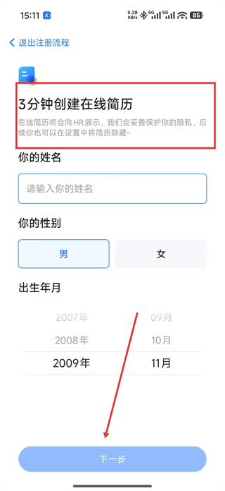 1、進入廣西人才網APP注冊流程頁面可查看3分鐘創建在線簡歷的提示,輸入姓名、選擇性別和出生年月后點擊下一步,開始簡歷創建。