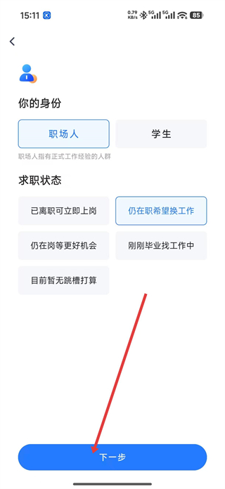 2、在身份選擇頁面選擇職場人或學生身份,如職場人再選擇求職狀態,如仍在職希望換工作后點擊下一步,完善求職身份信息。
