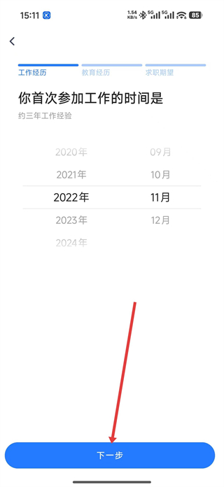 3、進入工作經歷頁面選擇首次參加工作的時間,如2022年11月后點擊下一步,完善工作經歷信息。