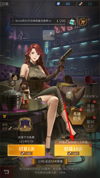 3、在招募界面點擊招募10次按鈕,參與十連招募,有機會獲得SR級以上英雄,快速擴充稀有英雄陣容。