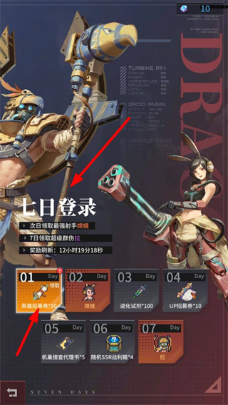 2、參與七日登錄活動,每日領取獎勵,如英雄招募券、資源等,積累道具,助力英雄養成和隊伍發展。