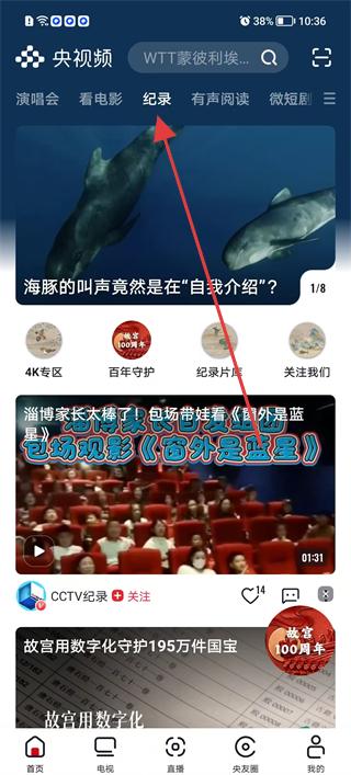 1、點擊紀錄頻道,瀏覽海豚的叫聲等紀錄片內容,查看4K專區、百年守護等板塊,了解紀錄片相關資訊,豐富知識儲備。