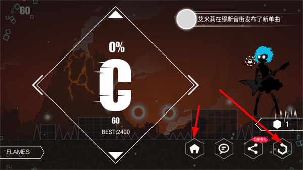 3、關卡結束后可查看評分,根據評分獲得獎勵,還可點擊相關按鈕返回主頁、分享成績或進行設置。