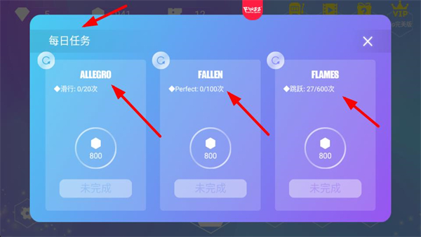 2、完成每日任務,如ALLEGRO滑行、FALLEN Perfect判定、FLAMES跳躍等任務,可獲得800金幣獎勵,積累資源。