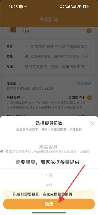 4、在餐具份數選擇環節可選擇無需餐具或需要餐具,確定后點擊確定,即可完成奶茶點單流程,等待商家制作和配送。