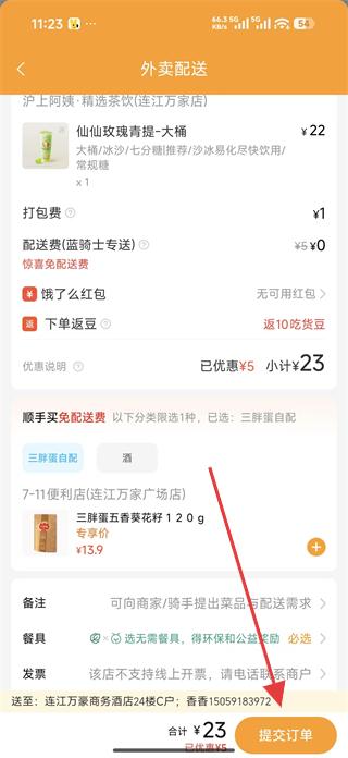 3、進入外賣配送結算頁面查看所選奶茶、打包費、配送費等信息,確認無誤后點擊提交訂單,進入餐具份數選擇環節。