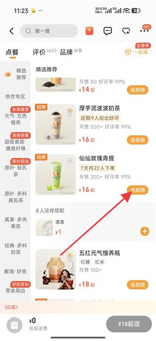 1、進入外賣軟件點餐頁面瀏覽精選推薦的奶茶,如厚芋泥波波奶茶、仙仙玫瑰青提等,點擊奶茶旁的選規格,進入規格選擇頁面。